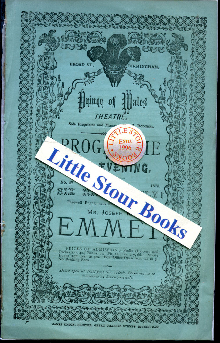 Original Vintage Souvenir Theatre Programme from the Prince of Wales Theatre, Broad Street, Birmingham (Formerly - The Royal Music Hall | Birmingham Music Hall | Prince of Wales Operetta House) With a Production for this Evening Six Nights Only - Mr Joseph K. Emmet (Programme Number 47) 1875.