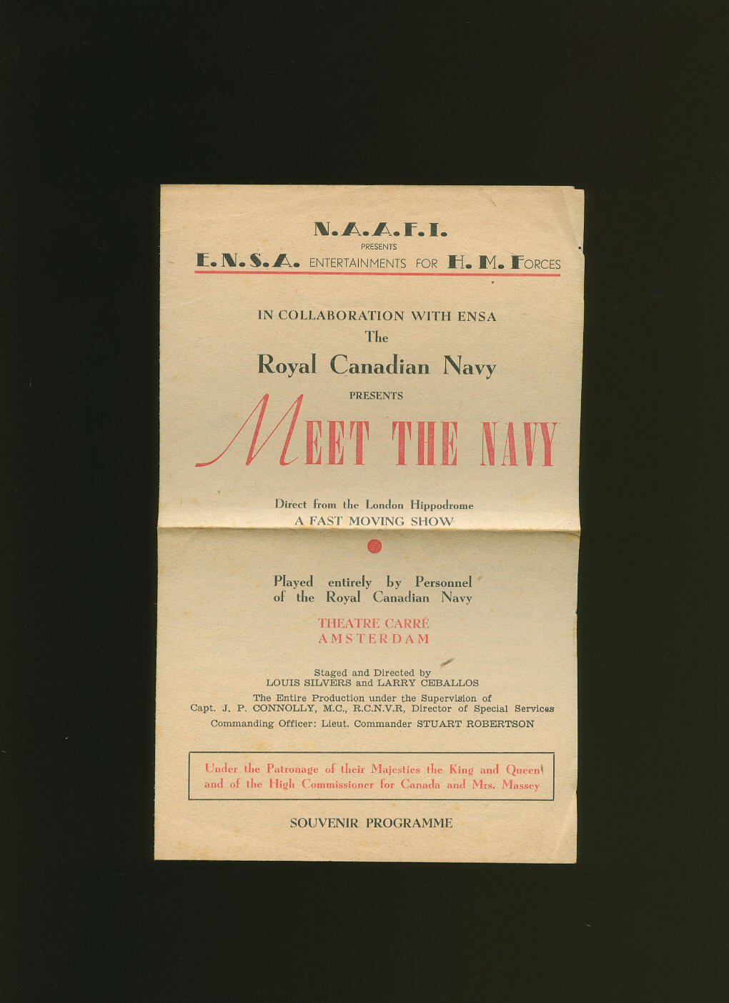 N.A.A.F.I. Presents E.N.S.A. Entertainment's for H. M. Forces in Collaboration with E.N.S.A. The Royal Canadian Navy Presents Meet The Navy: Souvenir Theatre Programme Direct from the London Hippodrome Played Entirely by Personnel of the Royal Canadian Navy and Performed at Theatre Carré, Amsterdam