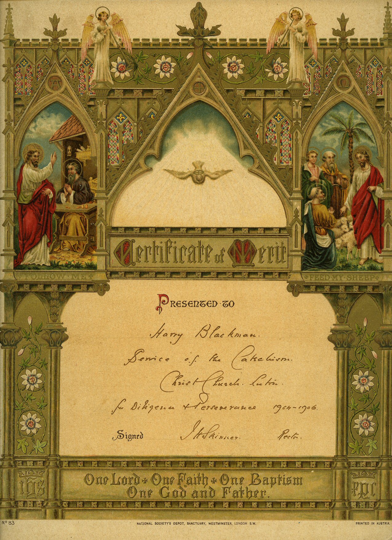 The Perry Picture Portfolio; Service of the Catechism [Christ Church, Luton] + Prize Certificate of Merit: Containing: The Last Supper; Christmas Chimes; Star of Bethlehem; Virgin, Infant Jesus and St. John; Angel Heads et al