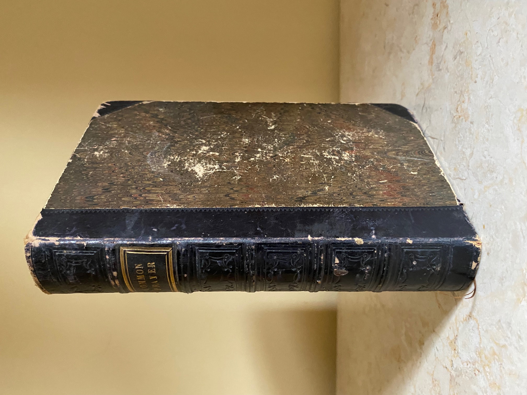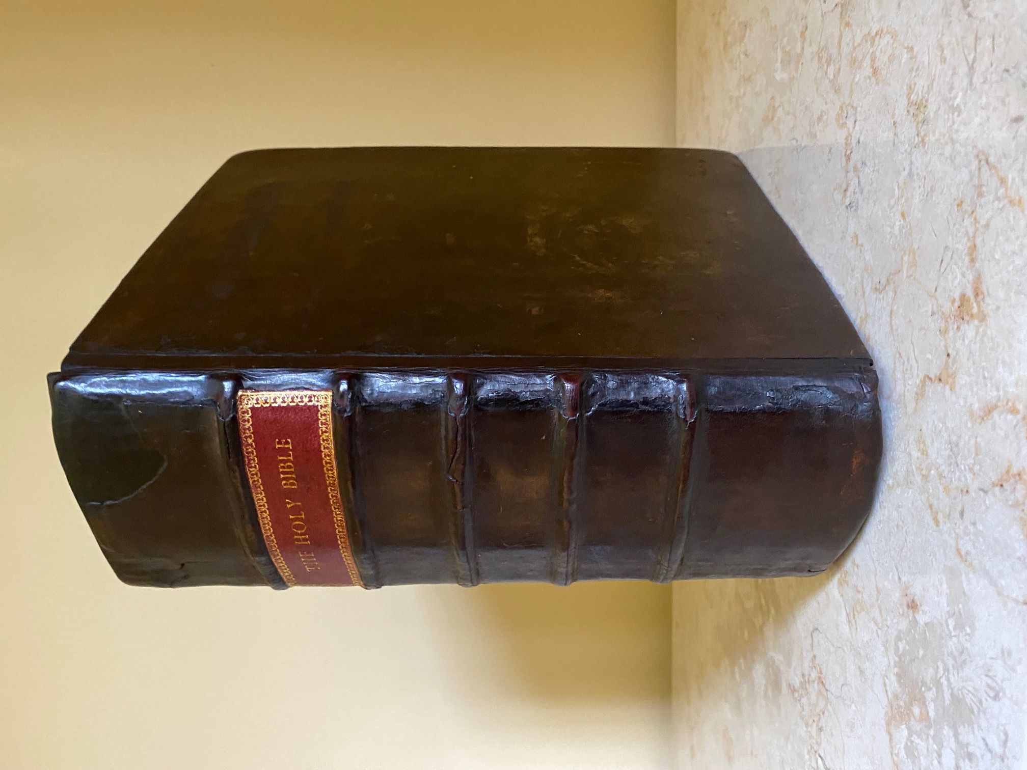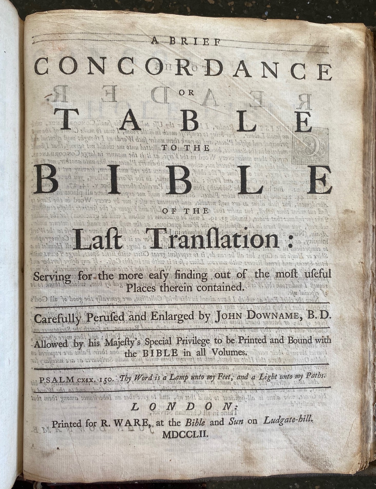 Calf repair preserving the original full brown leather covered boards, tooled with Cambridge panels front and rear, new handsewn headbands, new red morocco and gilt label to the spine, new handmade front end paper. Quarto. 10½'' x 9''. Old Testament title dated 1758. New Testament title dated 1757. John Downame's Concordance title dated 1752. Text in two columns. Various family pages filled in with neat, legible hand writing to the rear end papers and verso of New Testament title leaf. Heavy volume weighing 3 kg, extra postage will be requested over and above our default setting for destinations outside the UK. Member of the P.B.F.A.
