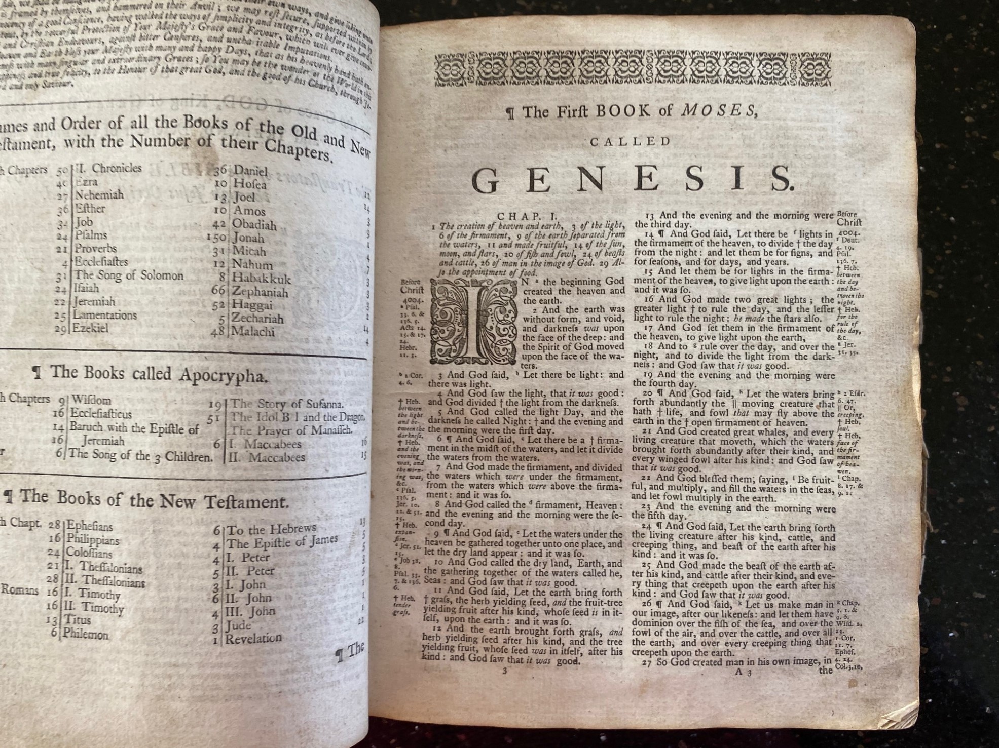 The Holy Bible, Containing the Old and New Testaments, Newly Translated out of the Original Tongues, and with the Former Translations Diligently Compared and Revised. By His Majesties Special Command. Appointed to be Read in Churches. Bound with An Act for the Uniformity of Common Prayer, and Service in the Church, and Administration of the Sacraments (Primo Eliz), The Preface, Proper Lessons to be Read at Morning and Evening Prayer and Holy-Days, Proper Psalms on Certain Days, The Calendar, A Table of the Moveable Feasts for Fifty Two Years According to the Foregoing Calendar, The Order for Morning Prayer, The Order for Evening Prayer Daily Throughout the Year, The Collects, The Communion, Publick Baptism of Infants to be Used in the Church, The Ministration of Private Baptism of Children in Houses, The Ministration of Baptism to such as are of Riper Years and Able to Answer for Themselves, A Catechism, The Order of Confirmation, The Form of Solemnization of Matrimony, The Order for the Visitation of the Sick, The Communion of the Sick, The Order for the Burial of the Dead, The Thanksgiving of Women and Child-Birth, Commonly Called The Churching of Women, A Commination or Denouncing of Gods Anger and Judgements Against Sinners, with Certain Prayers to be Used on the First Day of Lent, and at Other Times, as the Ordinary Shall Appoint, Apocrypha, and Concordance