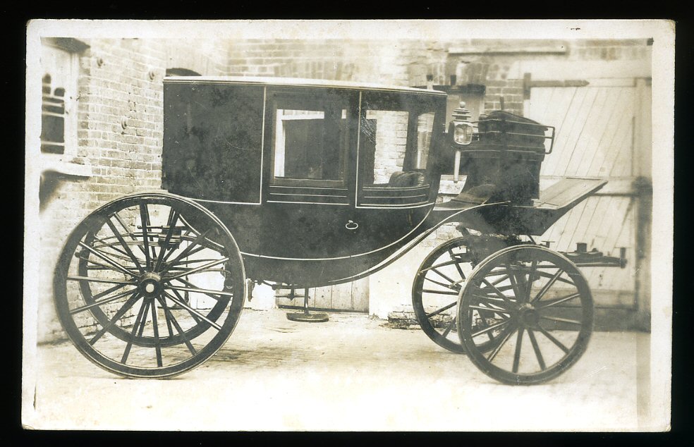5½'' x 3½'' unused post card. Carriages may be enclosed or open, depending on the type. The top cover for the body of a carriage, called the head or hood, is often flexible and designed to be folded back when desired. Such a folding top is called a bellows top or calash. A hoopstick forms a light framing member for this kind of hood. The top, roof or second-story compartment of a closed carriage, especially a diligence, was called an imperial. A closed carriage may have side windows called quarter lights (British) as well as windows in the doors, hence a "glass coach". On the forepart of an open carriage, a screen of wood or leather called a dashboard intercepts water, mud or snow thrown up by the heels of the horses. The dashboard or carriage top sometimes has a projecting sidepiece called a wing (British). A foot iron or footplate may serve as a carriage step. A carriage driver sits on a box or perch, usually elevated and small. When at the front it is known as a dickey box, a term also used for a seat at the back for servants. A footman might use a small platform at the rear called a footboard or a seat called a rumble behind the body. Some carriages have a moveable seat called a jump seat. Some seats had an attached backrest called a lazyback. The shafts of a carriage were called limbers in English dialect. Lancewood, a tough elastic wood of various trees, was often used especially for carriage shafts. A holdback, consisting of an iron catch on the shaft with a looped strap, enables a horse to back or hold back the vehicle. The end of the tongue of a carriage is suspended from the collars of the harness by a bar called the yoke. At the end of a trace, a loop called a cockeye attaches to the carriage. In some carriage types the body is suspended from several leather straps called braces or thoroughbraces, attached to or serving as springs. In Good condition. Member of the P.B.F.A.