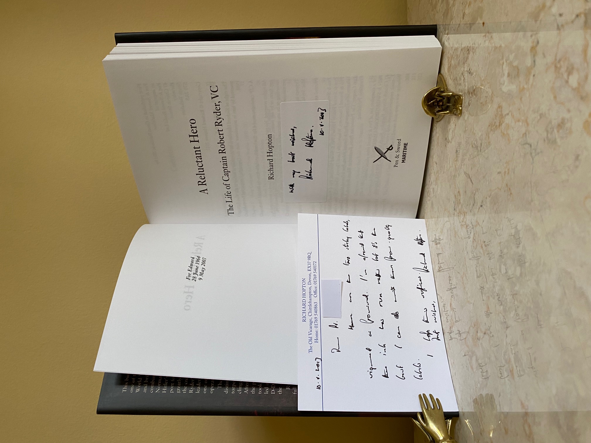 First edition hard back binding in publisher's original black paper covered boards, gilt title and author lettering to the spine. 8vo. 9½'' x 6¼''. Victoria Cross official citation: The King has been graciously pleased to approve the award of the Victoria Cross for daring and valour in the attack on the German Naval Base at St. Nazaire, to:Commander Robert Edward Dudley Ryder, Royal Navy. For great gallantry in the attack on St Nazaire. He commanded a force of small unprotected ships in an attack on a heavily defended port and led H.M.S. Campbeltown in under intense fire from short range weapons at point blank range. Though the main object of the expedition had been accomplished in the beaching of Campbeltown, he remained on the spot conducting operations, evacuating men from Campbeltown and dealing with strong points and close range weapons while exposed to heavy fire for one hour and sixteen minutes, and did not withdraw till it was certain that his ship could be of no use in rescuing any of the Commando Troops who were still ashore. That his Motor Gun Boat, now full of dead and wounded, should have survived and should have been able to withdraw through an intense barrage of close range fire was almost a miracle. Contains 224 pp with monochrome archive photographs to the centre pages Fine condition book in Fine condition dust wrapper, not price clipped, £19.99. White paper label to the title page SIGNED by the author 'With my best wishes, Richard Hopton. 10. v. 2013.' Loosely inserted hand written compliments card with the authors printed residence across the top and referring to the signed label SIGNED 'Richard Hopton.' Dust wrapper supplied in archive acetate film protection. Member of the P.B.F.A.