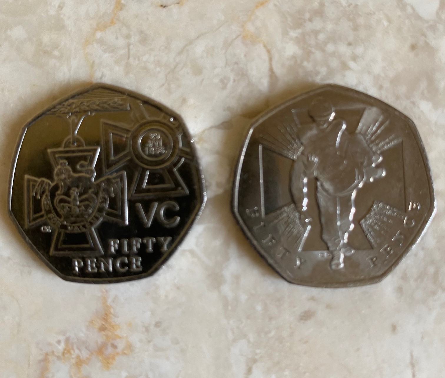 Two Victoria cross fifty pence piece coins. One featuring two depictions of medals the other a soldier carrying another wounded soldier. The obverse side of each coin features a portrait of Queen Elizabeth II by Ian Rank-Broadley. Established on 29th January 1856 for British and Commonwealth servicemen and women who have demonstrated 'most conspicuous bravery, or some daring or pre-eminent act of valour or self-sacrifice, or extreme devotion to duty in the presence of the enemy', the Victoria Cross is the highest and most prestigious medal in the British honours system. The VC was conceived during the Crimean War (1853-56), where the combined British, French and Ottomon armies drove the Russians out of Sebastopol and the Black Sea. The War is widely regarded as a turning point in modern warfare where industrial tactics started to come to the fore, and with them very high casualty and injury rates. + 8½'' x 5'' Victoria Cross 1856 - 2006 Royal Mail First Day Cover | one cachet insert featuring William Leefe Robinson V.C. who was the first British pilot to shoot down a German airship over Britain during the First World War and was the first man to be awarded the V.C. for a deed over the United Kingdom. Member of the P.B.F.A.